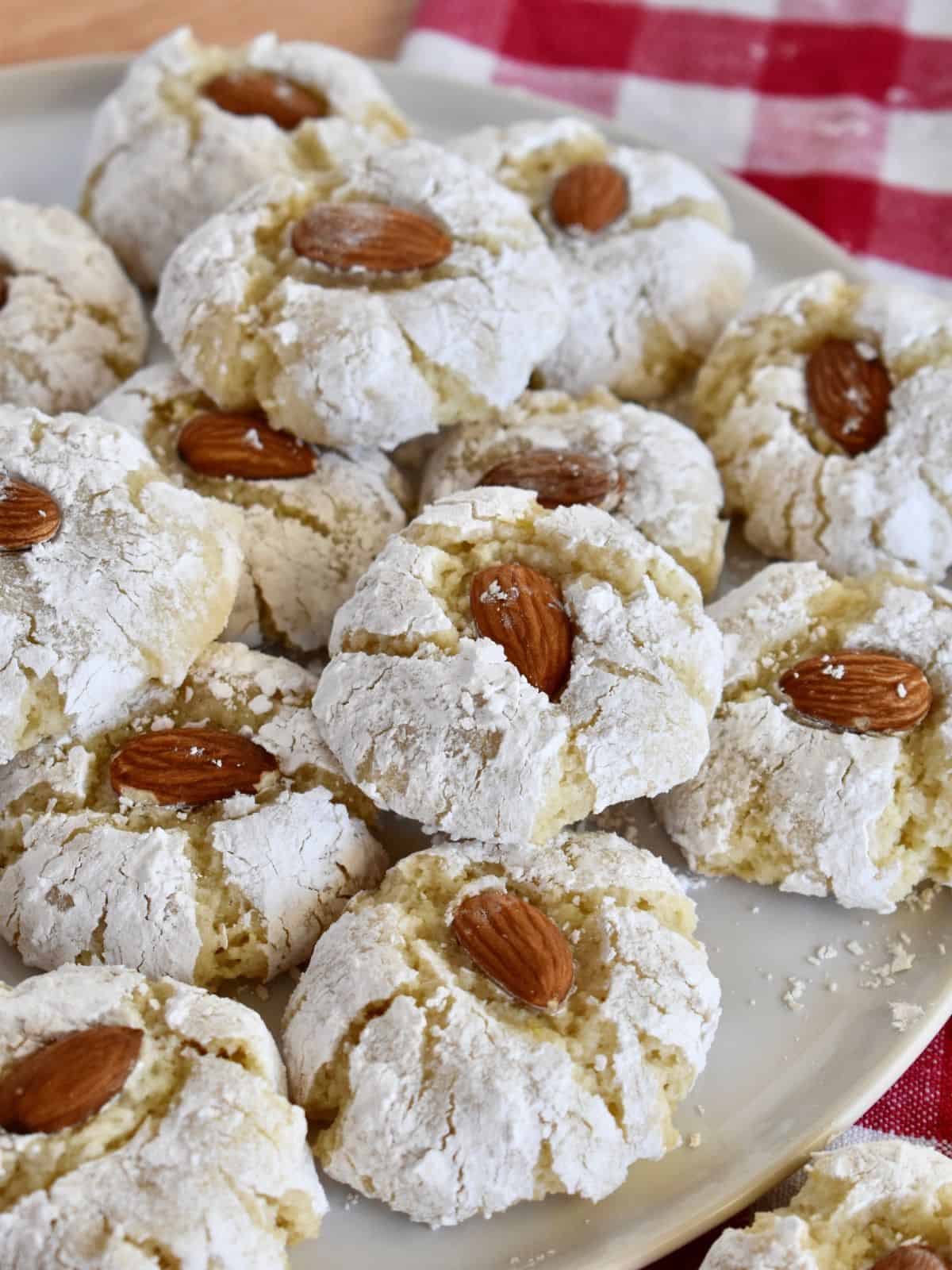 - Place on baking sheet with ~1.5 inches between cookies. Press almond on top of cookies.
